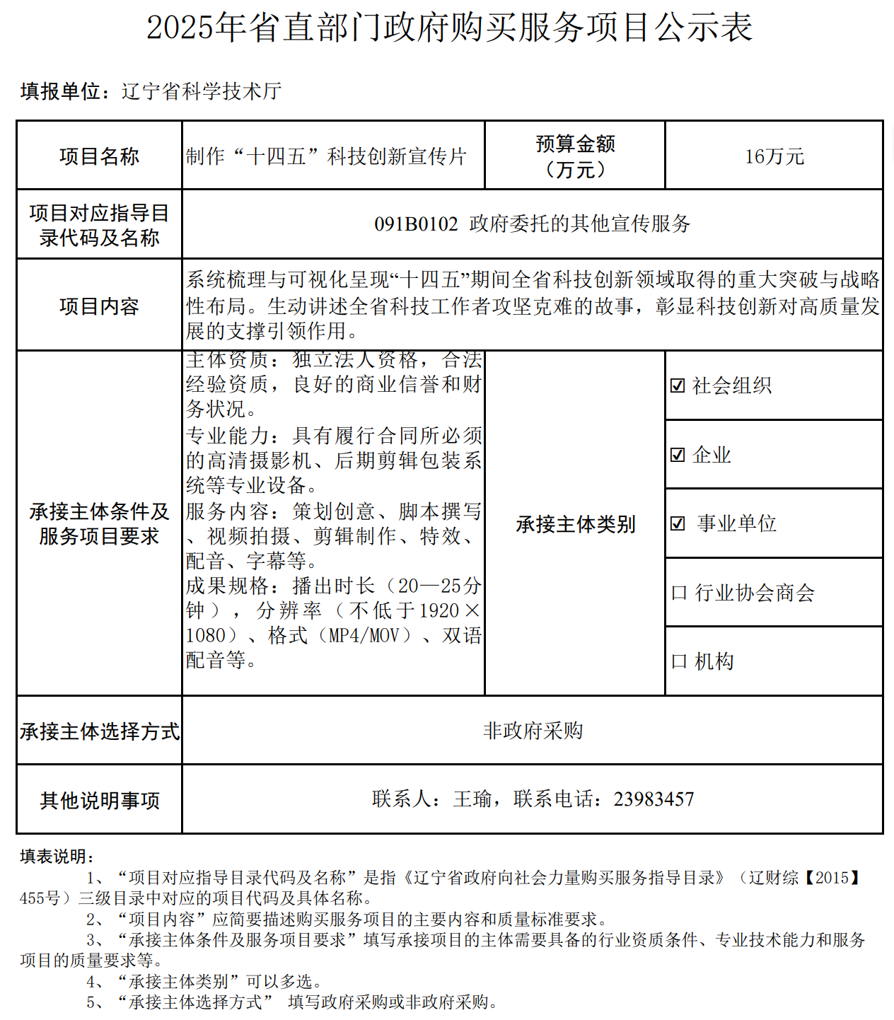 2025年省直部门政府购买服务项目公示表(制作“十四五”科技创新宣传片)