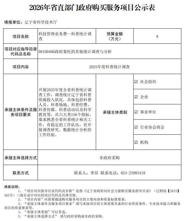 2026年省直部门政府购买服务项目公示表(2025科普统计)